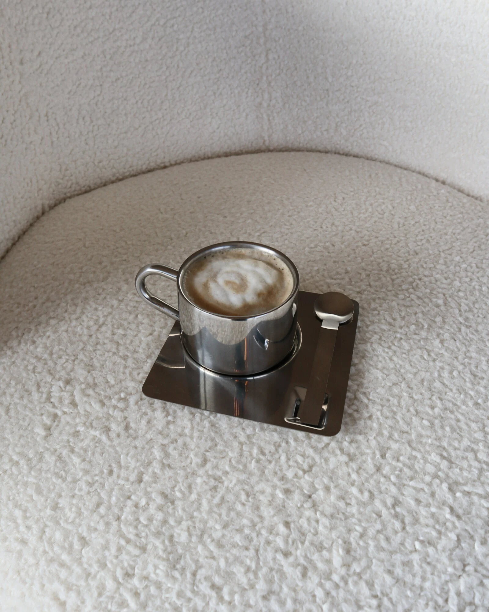 Designed with a seamless, bowl-like silhouette and a discreet integrated handle, the cups combine functional ergonomics with the restrained beauty of Scandinavian industrial design.