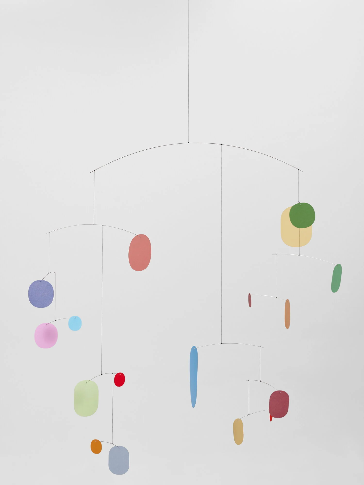 Crafted from powder-coated steel in a harmonious multicolor palette, the mobile is mounted on a solid beechwood crossbar with a ceiling-mounted suspension hook included for easy installation.
